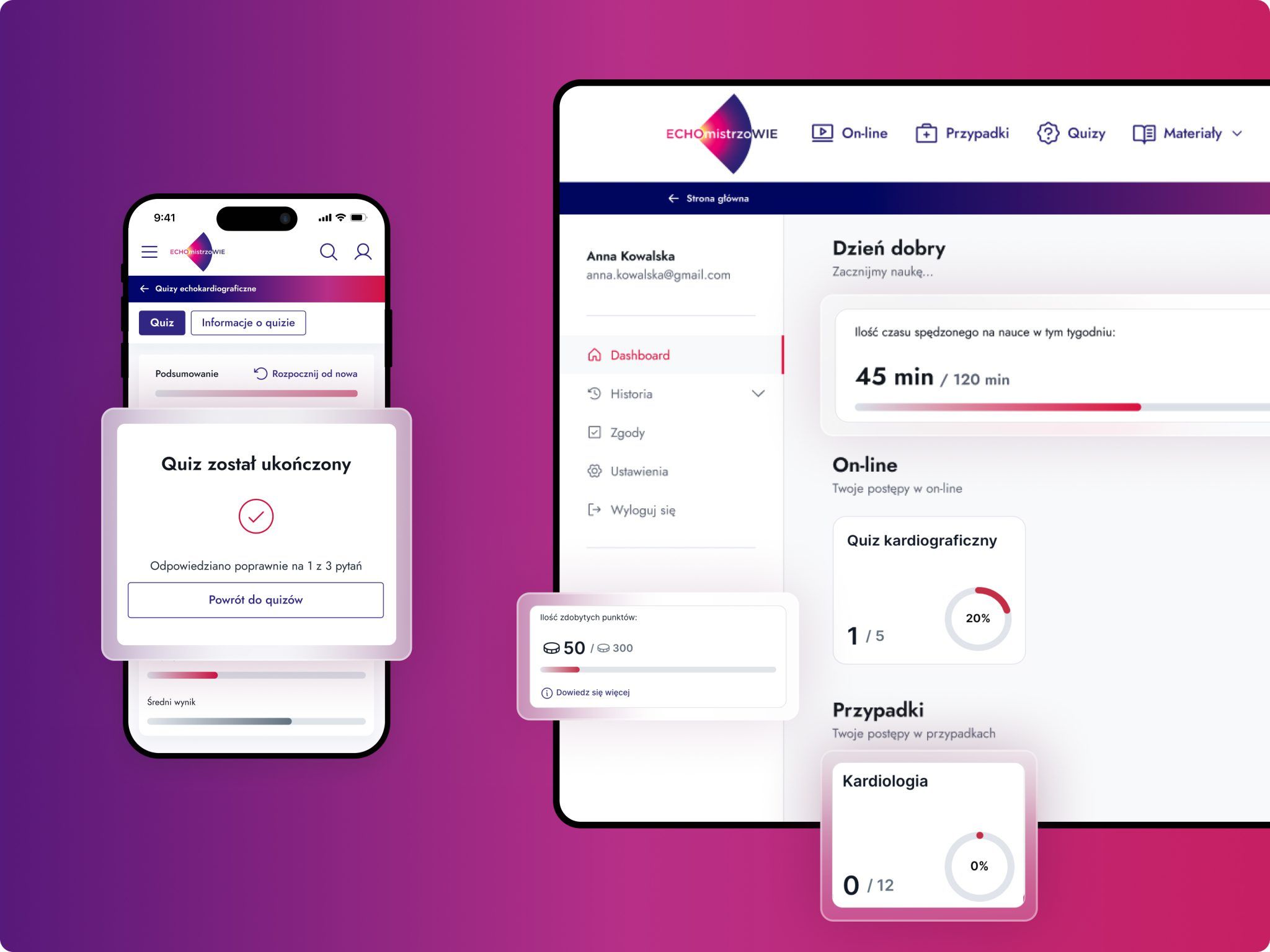 Platforma ECHOmistrzoWIE z powodzeniem przeszła fazę uruchomienia i rozpoczęła funkcjonowanie w środowisku kardiologicznym. Już w pierwszych tygodniach działania użytkownicy aktywnie uczestniczą w ścieżkach edukacyjnych, zdobywają punkty w ramach gamifikacji i wymieniają je na nagrody – co potwierdza gotowość platformy do skalowania działań edukacyjnych i marketingowych.
